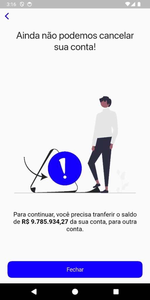 Se houver saldo ou operações pendentes, será exibido um aviso. Regularize e repita o processo.